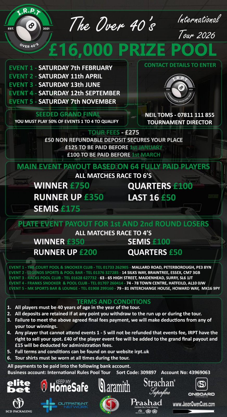 The IRPT Over 40’s Tour consists of five events throughout the year.